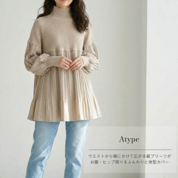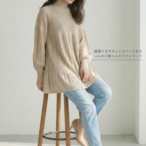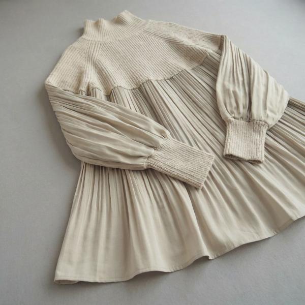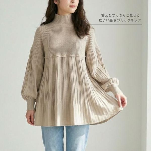春 チュニック レディース チュニックワンピース プリーツチュニック モックネック バルーンスリーブ パフスリーブ ゆる シルエット フレア ニット トップス