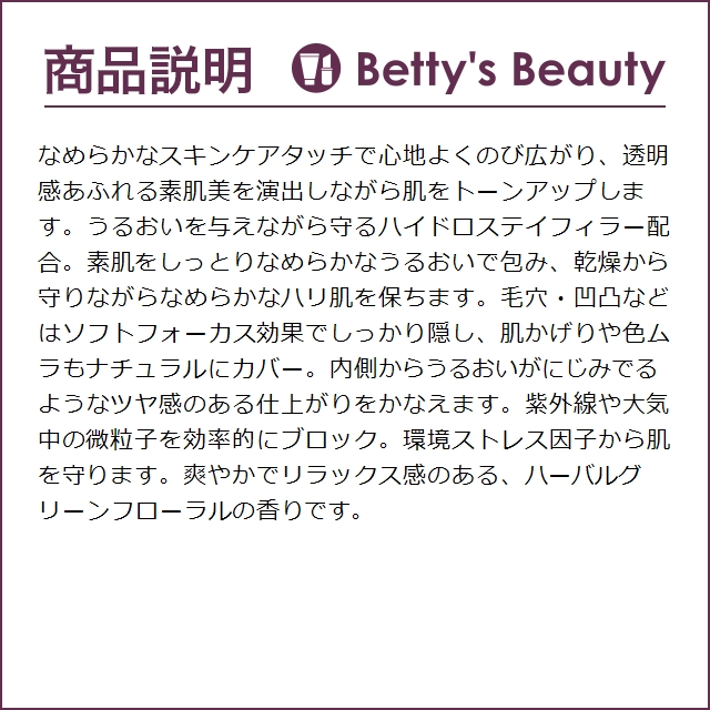 ◇なめらかなスキンケアタッチで心地よくのび広がり、透明感あふれる素肌美を演出しながら肌をトーンサポートします。うるおいを与えながら守るハイドロステイフィラー配合。素肌をしっとりなめらかなうるおいで包み、乾燥から守りながらなめらかなもちもち感肌を保ちます。毛穴・凹凸などはソフトフォーカスサポートでしっかり隠し、肌かげりや色ムラもナチュラルにカバー。内側からうるおいがにじみでるようなツヤ感のある仕上がりをかなえます。紫外線や大気中の微粒子を効率的にブロック。環境ストレス因子から肌を守ります。爽やかでリラックス感のある、ハーバルグリーンフローラルの香りです。