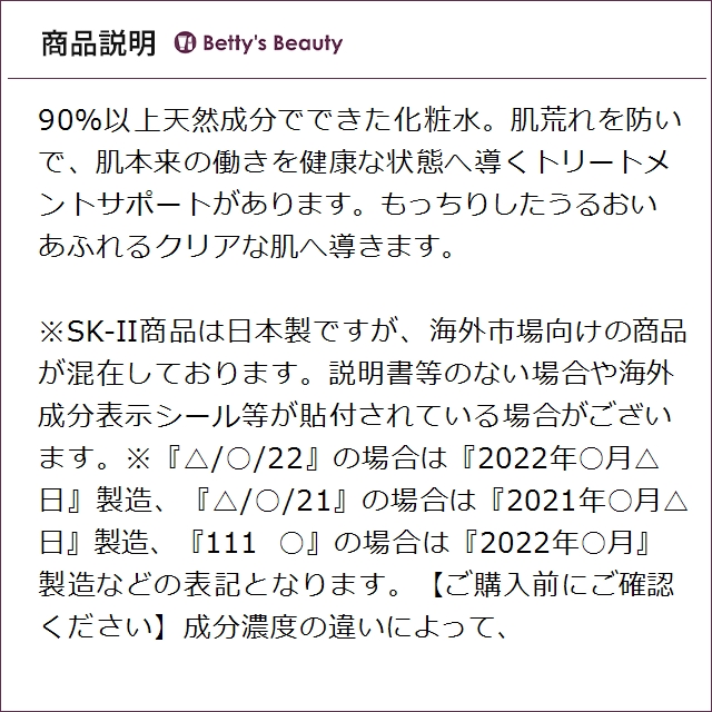※SK-II商品は日本製ですが、海外市場向けの商品が混在しております。説明書等のない場合や海外成分表示シール等が貼付されている場合がございます。※『△/○/22』の場合は『2022年○月△日』製造、『△/○/21』の場合は『2021年○月△日』製造、『111 ○』の場合は『2022年○月』製造などの表記となります。