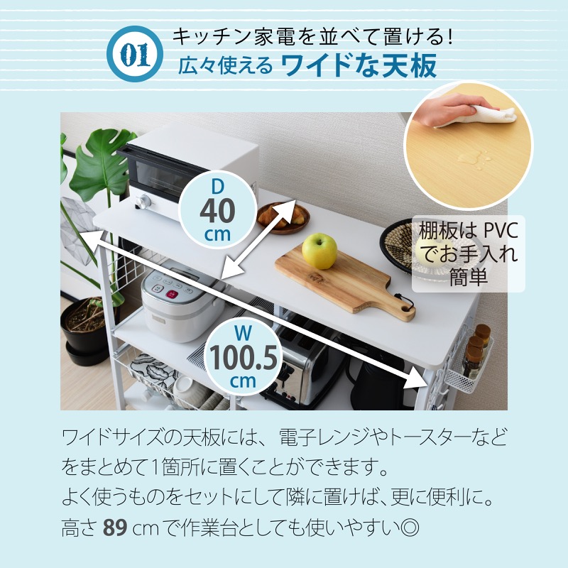 Basketton レンジラック ワイド 幅 100 レンジ台 大型レンジ対応 キッチンカウンター 作業台 おしゃれ 収納 キッチン収納 キャスター付き