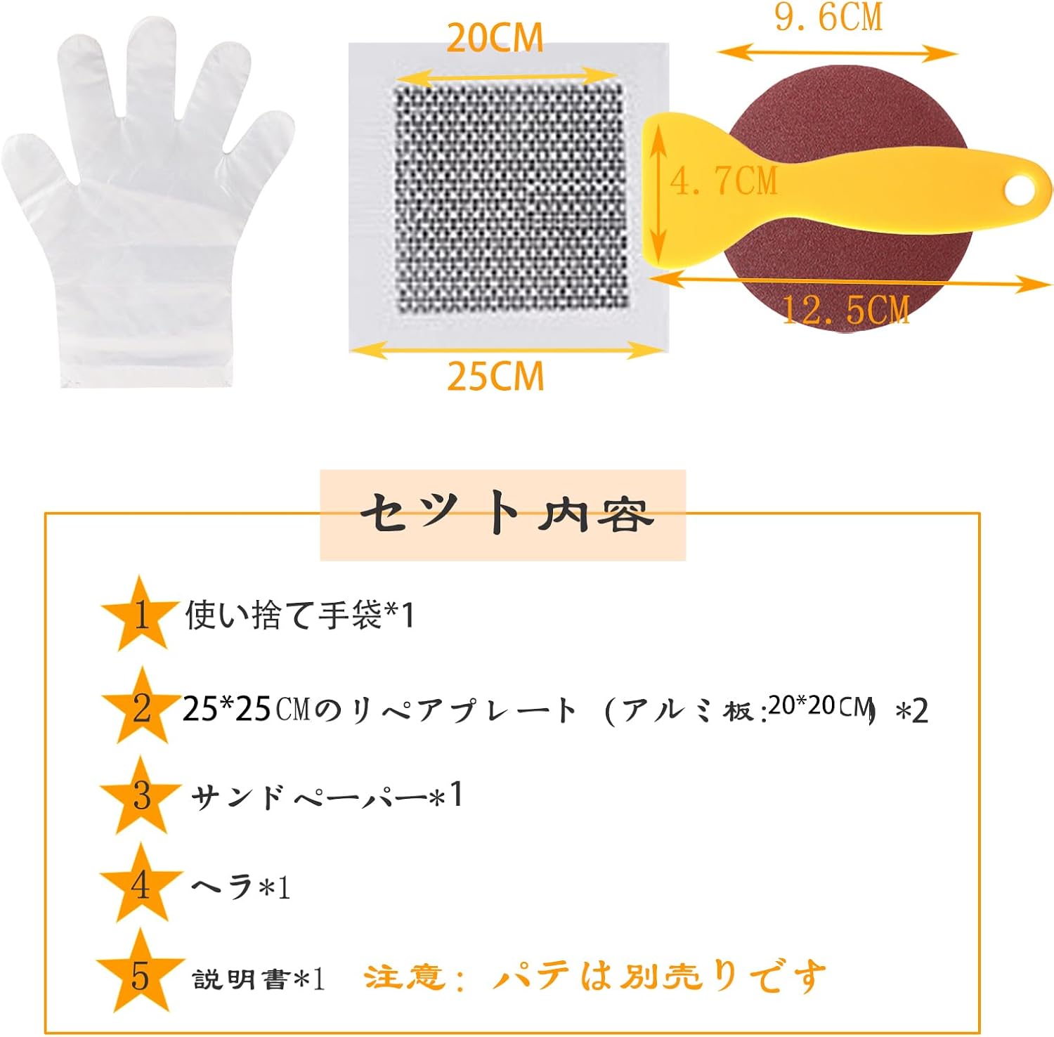 【パッケージ内容】サンドペーパー*1、ヘラ*1、25*25cmのリペアプレート(アルミ板:20*20cm)*2、使い捨て手袋*1、説明書*1。パテは別売りです。