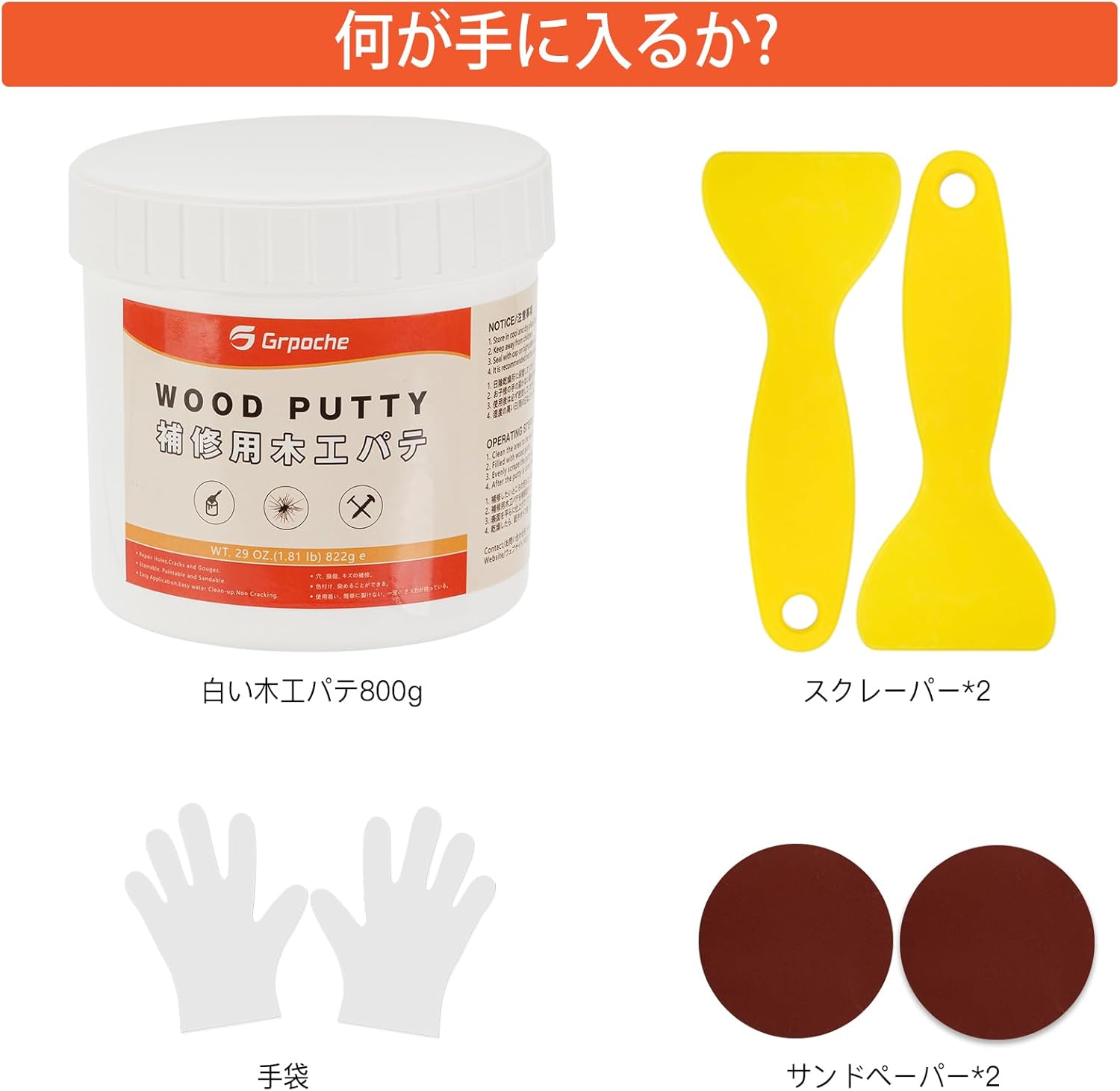 【商品詳細】800gホワイト木工パテ*1、ヘラ*2、サンドペーパー*2、手袋*2。取扱説明書付き。