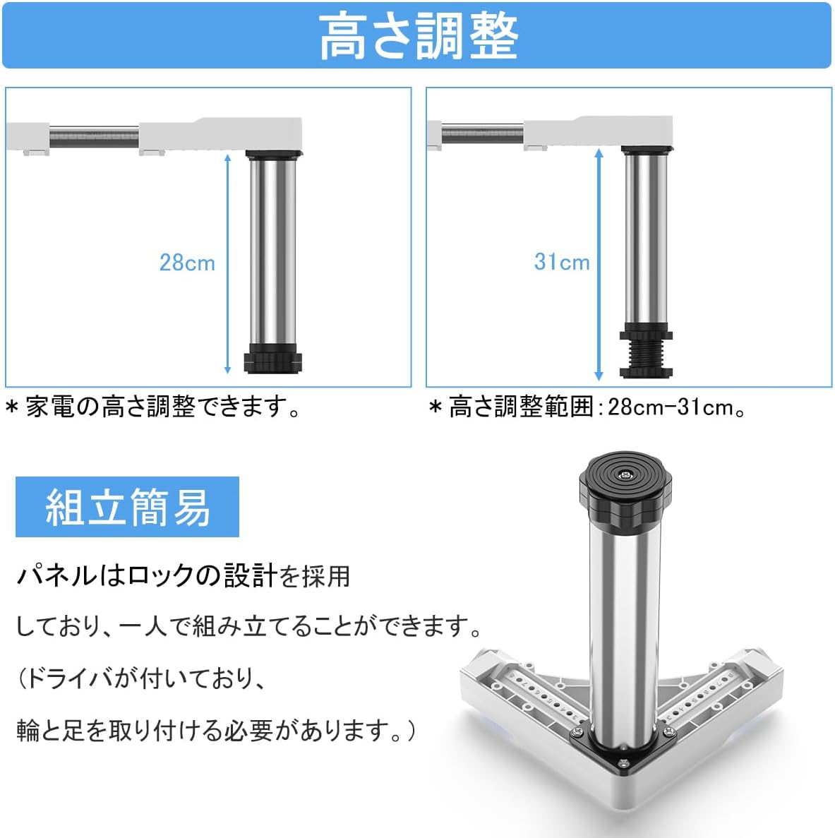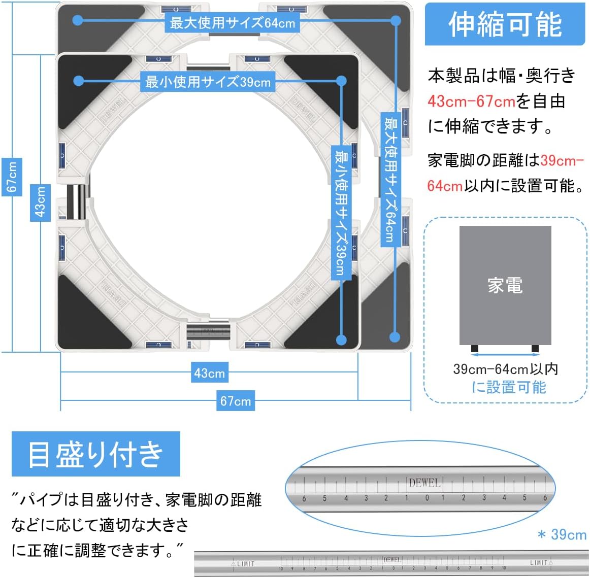 【伸縮可能高さ調整】幅調整範囲:43cm~67cm、高さ調整範囲:28cm-31cm、乾燥機や冷蔵庫などの大型家具に合わせて、幅奥行き高さを自由に伸縮できます。エアコン、冷蔵庫、食器棚洗濯機、植木鉢、大型機器など、さまざまな家具に使用することができます。