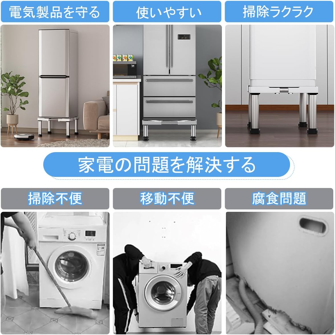 【家電問題を解決】:家電の移動困難、騒音振動、湿っぽい、錆び腐食、電気漏れ、排水不便などの問題を解決する神器 。家電製品と床との接触を減らし、不便な排水と清掃の問題を解決できます!