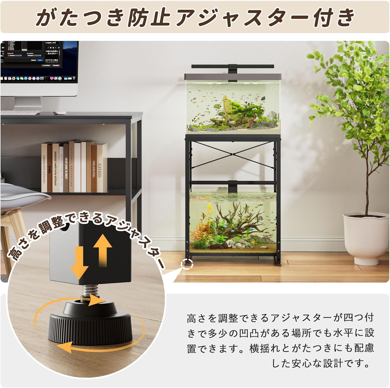 【アジャスター付き】この水槽台 45cmはアジャスターが四つ付き、多少の凹凸がある場所でも水平に設置できます。