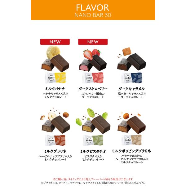 「ナノバー30個入」は、ガレーの中でも手土産にちょうどいいサイズ感とパッケージの可愛さで人気!6種類のフレーバーを楽しめるアソートセットです。
