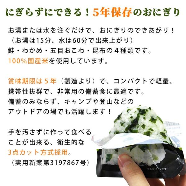 爆買 非常食 5年保存 携帯おにぎり4種セット アルファ米 尾西食品 鮭・わかめ・五目おこわ・昆布 防災グッズ 賞味期限2030年11月迄[M便 1/8]