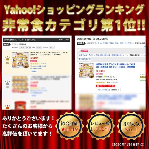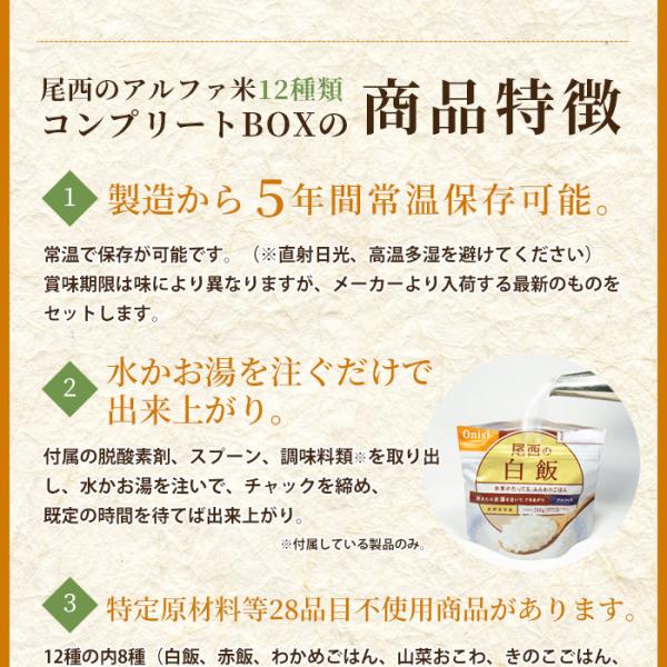 非常食と言えばアルファ米と言っても過言ではないほど、今の防災食の主役“アルファ米”。その中でも特に味に定評があり人気の「尾西食品」のアルファ米シリーズきのこごはん、松茸ごはん、白飯、赤飯、わかめご飯、山菜おこわ、五目ご飯、白がゆ、梅がゆ、ドライカレー、チキンライス、えびピラフの12種類をセット!コンプリートBOXでお届けします!