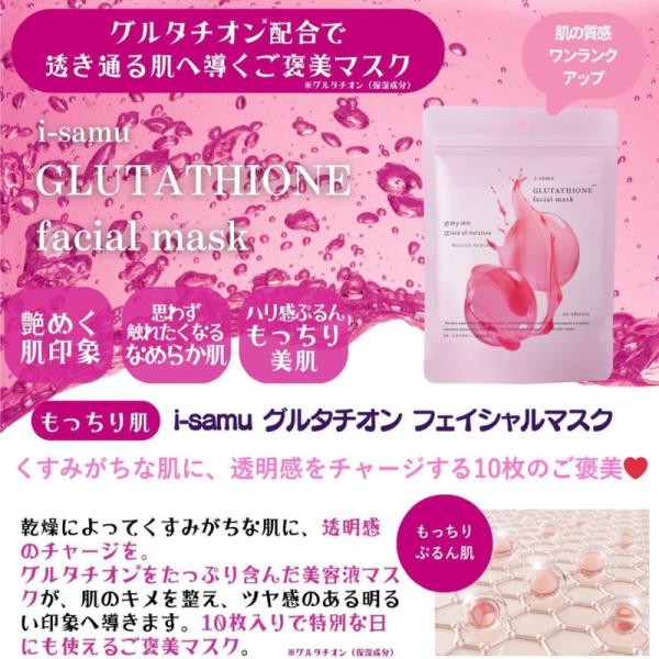 乾燥によって くすみ がちな肌に、透明感を与えたい方は グルタチオン マスクを。 ツヤ感のある明るい印象へ導きます。