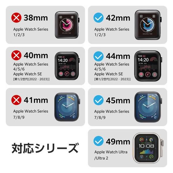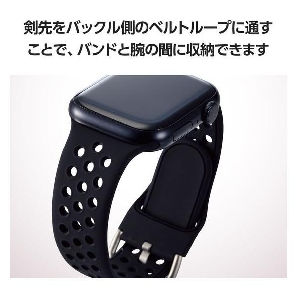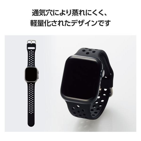 【商品説明】たくさんの通気穴が特徴的なAppleWatch用シリコンバンドアクティブタイプです。 通気穴により蒸れにくく軽量化されたバンドはスポーツにも最適です。 柔らかく装着感の良いシリコン製です。 汗や水に強く、耐衝撃性に優れたシリコン素材を採用しています。 バックル側のベルトループに剣先側を通すことで、剣先がバンドと腕の間に収まります。【仕様】●対応機種:Apple Watch Ultra 2、Ultra [49mm]、Apple Watch Series 9、 8、7 [45mm]、Apple Watch SE (第2世代)、SE、Series 6、5、4 [44mm]、Apple Watch Series 3、2、1 [42mm] ●セット内容:バンド×1 ●材質:バンド本体:シリコン ●カラー:ブラック ●バンドサイズ:150mm〜190mm ※装着可能な手首のサイズ