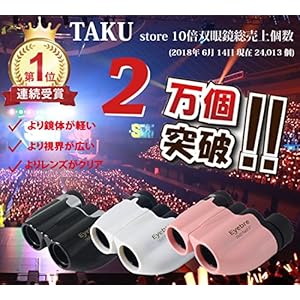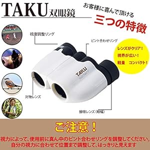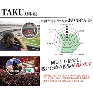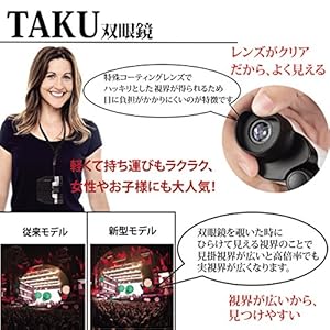 【TAKU STORE 双眼鏡が長年愛される理由とは?】ドームから中小ホールまで、見やすさ、レンズの質、大きさ、持ちやすさ、ストラップに至るまで、いつ 何にでも合うように。最高の思い出をあなたに!【レンズがクリア】特殊コーティングレンズで、コンサートやスポーツ観戦など、拡大倍率10倍を維持したまま、より鮮明でクリアに見えます。【視界が広い】より明るく鮮明に見えるように、実際に見える視界(見掛視界)を見直すことで以前よりさらに、広角な視界を捉えることが可能になりました。視界をより広くすることでコンサート会場で好きなアーティスト、スポーツ観戦で好きな選手の動きを逃がさず見ることが出来るようになりました。【小型軽量】ボディは軽量かつ耐久性のあるマグネシウム合金製です。重量わずか137g!想像よりコンパクトでどこへでも持ち歩けると好評です!女性やお子様でも持ち運びしやすいため、手や腕が疲れることはありません。【楽々、ピントと目幅調整】目幅が調整可能なことはもちろん、とても簡単にピント合わせができるのでどなたでもご使用。調節方法は本体を持って、真ん中の軸を中心に折り曲げるようにして調節します。左右の眼で見える視界の円が1つに重なった時の幅が、正しい位置になります。【安定性&低照度ナイトビジョン】長時間使用しても気分が悪くなることはありません。また、ある程度の暗闇でも使用可能です。 【耐久性&生活防水】ボディは軽量かつ耐久性のあるマグネシウム合金製です。生活防水対応で、突然の雨や水しぶきでも安心して使えます。メガネを掛けたままでも使用可能です。【仕様】倍率10倍 対物レンズ有効径:22mm 実視界:7.5° 1000m先の視界:112m 本体重量:137g 収納ケース、ストラップ付きなのでコンサートやアウトドアにも便利です!