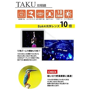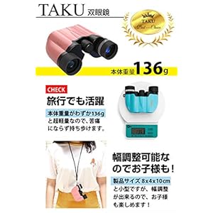 【TAKU STORE 双眼鏡が長年愛される理由とは?】ドームから中小ホールまで、見やすさ、レンズの質、大きさ、持ちやすさ、ストラップに至るまで、いつ 何にでも合うように。最高の思い出をあなたに!【レンズがクリア】特殊コーティングレンズで、コンサートやスポーツ観戦など、拡大倍率10倍を維持したまま、より鮮明でクリアに見えます。【視界が広い】より明るく鮮明に見えるように、実際に見える視界(見掛視界)を見直すことで以前よりさらに、広角な視界を捉えることが可能になりました。視界をより広くすることでコンサート会場で好きなアーティスト、スポーツ観戦で好きな選手の動きを逃がさず見ることが出来るようになりました。【小型軽量】ボディは軽量かつ耐久性のあるマグネシウム合金製です。重量わずか137g!想像よりコンパクトでどこへでも持ち歩けると好評です!女性やお子様でも持ち運びしやすいため、手や腕が疲れることはありません。【楽々、ピントと目幅調整】目幅が調整可能なことはもちろん、とても簡単にピント合わせができるのでどなたでもご使用。調節方法は本体を持って、真ん中の軸を中心に折り曲げるようにして調節します。左右の眼で見える視界の円が1つに重なった時の幅が、正しい位置になります。【安定性&低照度ナイトビジョン】長時間使用しても気分が悪くなることはありません。また、ある程度の暗闇でも使用可能です。 【耐久性&生活防水】ボディは軽量かつ耐久性のあるマグネシウム合金製です。生活防水対応で、突然の雨や水しぶきでも安心して使えます。メガネを掛けたままでも使用可能です。【仕様】倍率10倍 対物レンズ有効径:22mm 実視界:7.5° 1000m先の視界:112m 本体重量:137g 収納ケース、ストラップ付きなのでコンサートやアウトドアにも便利です!