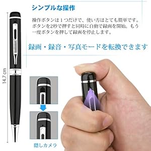 ★【商品仕様】 ●動画解像度1280*720/1920*1080P ●静止画解像度は2560*1440P ●フレームレート:30FPS ●映像フォーマット:AVI ●録音フォーマット:WAV ●写真フォーマット:JPG ●サポートメモリ:32GB(SD HC対応(micro SD HCカードは付いていません)●インタフェース類型:USB2.0 ★【高解像度】 ●動画解像度1280*720/1920*1080P、静止画解像度は2560*1440Pで、細部まで鮮明な映像の撮影が可能で、高精細なHD画面を実現できます。 ●縦4.7cmのペン型隠しカメラで、軽くて小さくて、携帯にも非常に便利である。 ★【実用性】 ●ペン型隠しカメラが録画と写真どちらも実現しました。会議、旅行、商談と証拠撮影または生活での防犯対策などの様々な場所に適用します。 ●オフ状態で、USBコードでパソコンと接続して、USBモードに入る。短時間にボタンを押してPC cameraモードに転換することができます。 ★【録音機能】 ●最新技術を採用されて、ボイスレコーダーに単独で使用可能、講義、授業、会議や商談の記録としても役立ちます。 ●ご注意:使用前にTFカードを挿入するか確認してください。 ★【シンプルな操作】 ●写真を撮る 待機状態で、短時間にボタンを押して、緑色ライトが1回点滅して写真を1枚保存します。 ●録画 待機状態で、緑色ライトが長時間に点灯し、ボタンを2秒間押して緑色ライトが2回点滅し、録画は始まります。録画状態で、短時間にボタンを押して緑色ライトが長時間に点灯し、録画を保存したあと待機状態に戻します。10分おきに録画を一段保存します。 ●録音 待機状態で、短時間にボタンを2回押して緑色ライトがゆっくり点滅し、録音状態に入る。短時間にボタンを押して緑色ライトが長時間に点灯し、待機状態に戻し、録音を保存する。5分おきに録音を一段保存します。 ★【リアルな質感】 ●ペン型隠しスパイカメラデザインのため、持ち運びが便利です。胸ポケット、バッグなど様々なビジネスシーンに挿して、様々なシーンで誰にもばれずに、自然な録画が可能です。 ●使わないときペンとして使用してください。 ★【適用場所】 ●いじめや虐待・犯罪行為の証拠に ●会議、講演、授業、セミナーなどの記録に ●お部屋や会社等にの防犯に ●子供やお年寄り等に気付かれずに撮影が出来る。 ★【付属品】 ●本体x 1 ●USBケーブルx 1 ●日本語取扱説明書x 1 ★【保証期間】 ●12ケ月間品質保証 ●何か問題がございましたら、お気軽にご連絡ください。