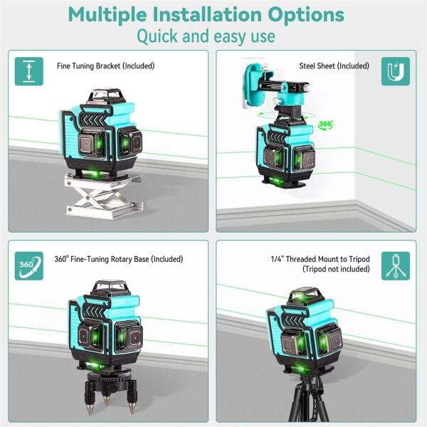 【4 x 360°レーザー墨出し器】4 x 360°クロスラインレーザー4D 16ラインクロスラインレーザーグリーン、2つの水平360°と2つの垂直360°レーザービームは、デバイスとリモコンの対応するボタンを使用して選択できます。 合計16本のレーザー交差ラインが形成されます。