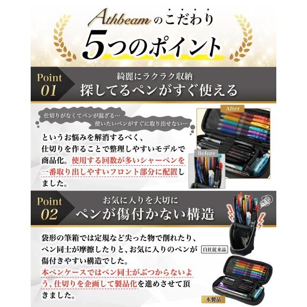 【大切な文具を傷つけない】 Athbeam ペンケース がついに正式販売開始。 お気に入りのペンを傷つけたくない…というお客様の声から生まれた収納力抜群の ペンケース です。 Athbeam ペンケース にはペンホルダーやメッシュポケットなどの収納場所が豊富にあるので、お気に入りのペンとペンを接触させずに収納することができます。さらに2段構造の収納部が消しゴムや付箋などの小物の取り出しをスムーズにします。