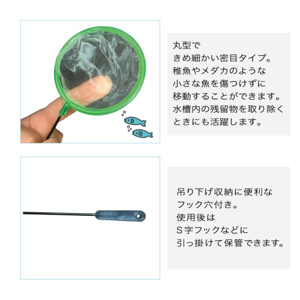 金魚、メダカ、ブラインシュリンプエッグス、水槽内のゴミなどを掬うときに便利なフィッシュネット。