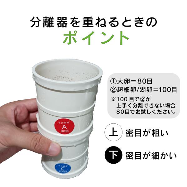 超細卵 / 湖卵:100メッシュ(100メッシュで上手く分離ができない場合、80メッシュで試してみてください。)