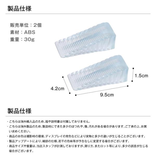 通常の引き戸へのドアストッパーはもちろん、 スライドドアのストッパーとしても活躍。 ドアに挟むだけなので、簡単に着脱が可能です。 クリアタイプだからお部屋の雰囲気の邪魔になりません。 嬉しい2個セットでお届けします。