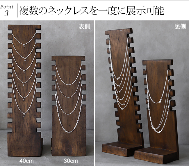 こちらは高さ40cmのタイプで、ネックレスやチョーカーを11本掛けることができます。一度に複数のネックレスをディスプレイすることができるので、イニシャルや誕生石のようなバリエーションがあるネックレスを魅力的に展示するのに最適です。