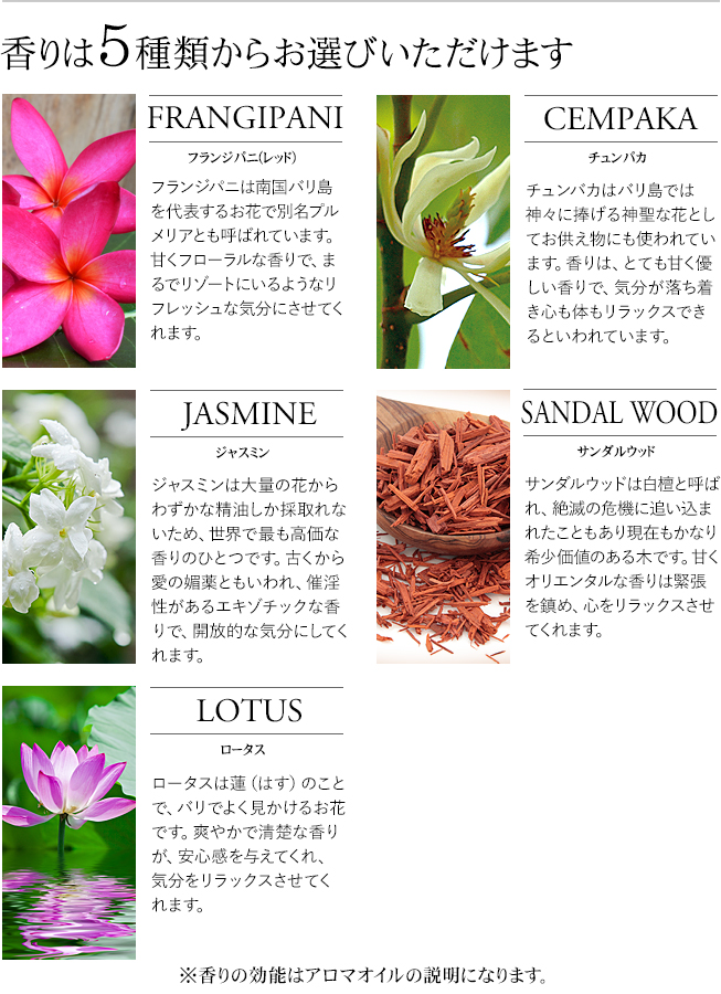 香りは「フランジパニ」「チュンパカ」「ジャスミン」「サンダルウッド」「ロータス」の5種類。