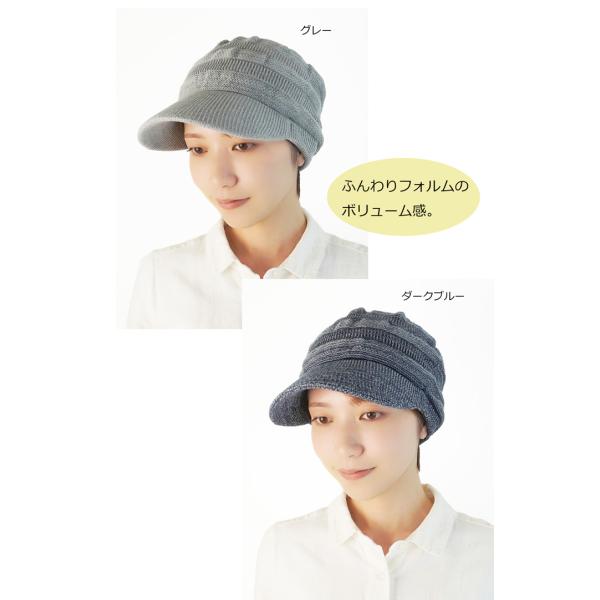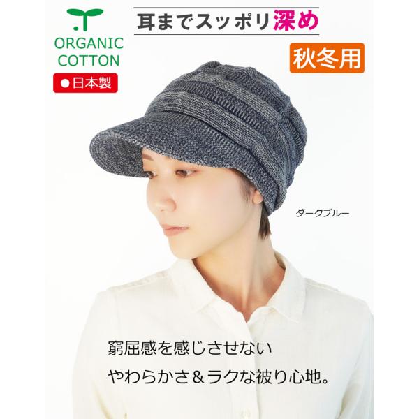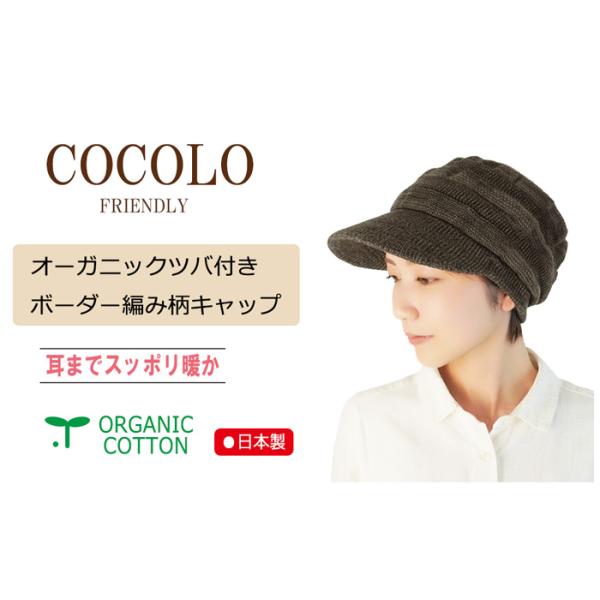 医療用帽子 秋冬用 オーガニック 【ツバ付き】ボーダー編み柄キャップ【秋冬用】【耳までスッポリ】【深め】抗がん剤帽子 脱毛