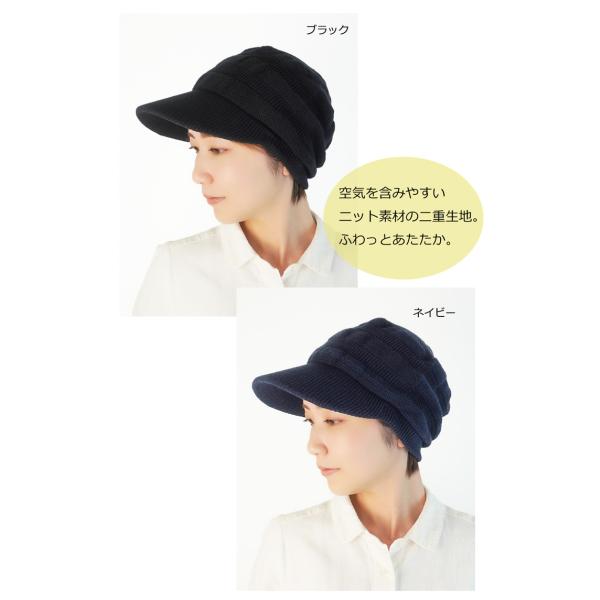 耳までスッポリ被れ空気層を含みやすいニット素材の二重生地だから、 ふわっとあたたか。