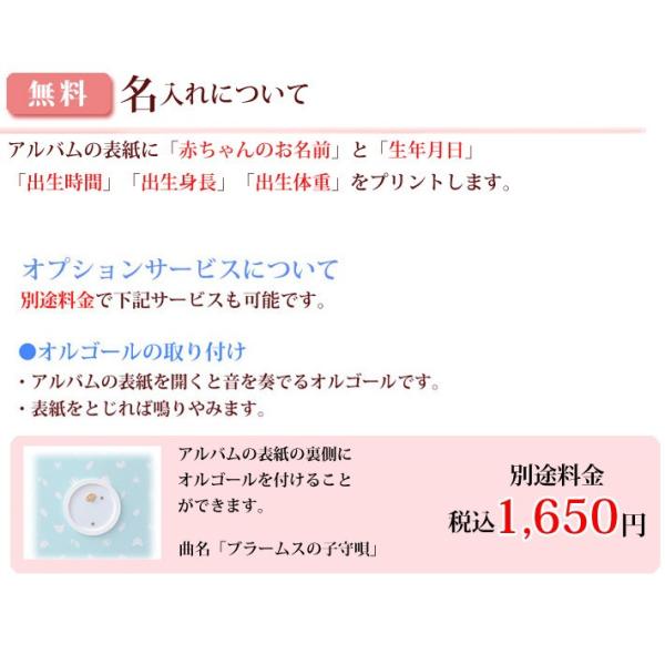 アルバムの表紙に「赤ちゃんのお名前」と「生年月日」「出生時間」「出生身長」「出生体重」を名入れするオーダーメイドのアルバムです。