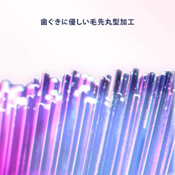 2種類の毛を組み合わせたタフト・イン・タフト毛束が、精巧に計算された16度の角度にぎっしりと植毛。内側の長い毛先が歯間に入り、外側の長い毛先が歯の方面の歯垢にアプローチする仕組みで、優しくありながら歯垢をしっかりかき出します。