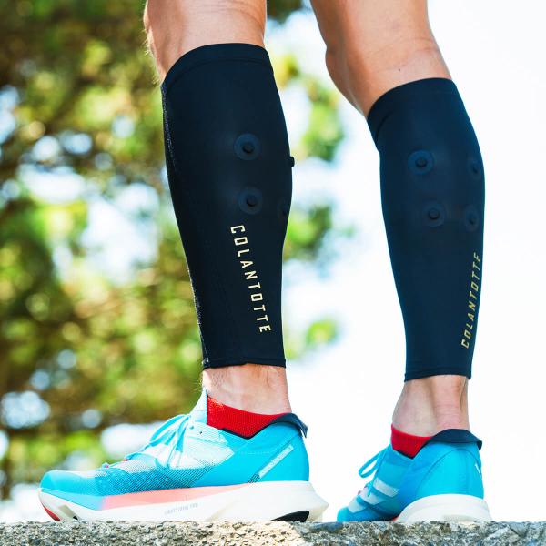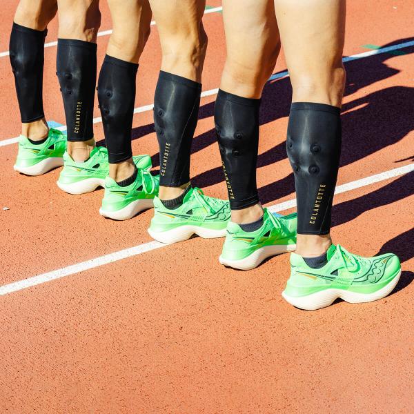 外側にテンションをかける構造により着地する際の傾きを抑制する事で、走行中のパフォーマンスUPが期待できるハイスペック磁気カーフサポート。