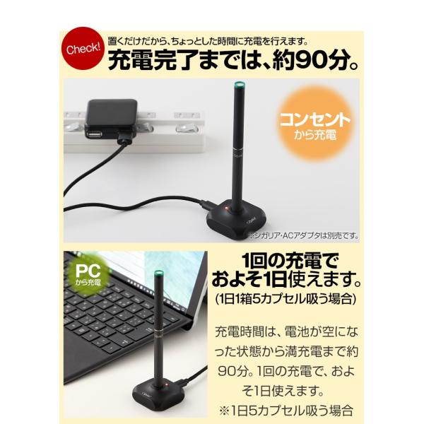 ●充電時間は90分、およそ1箱(5カプセル)吸える。