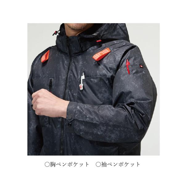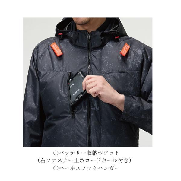 ヘルメット収納フード(着脱可能)、フックハンガー、背ランヤードホールを配備しフルハーネスに完全対応。