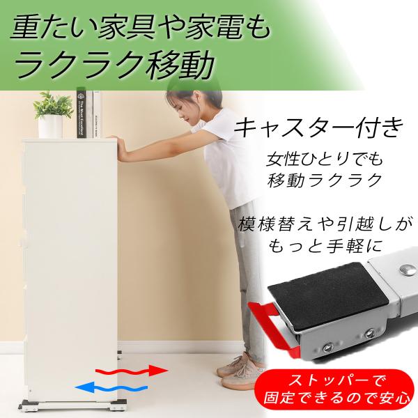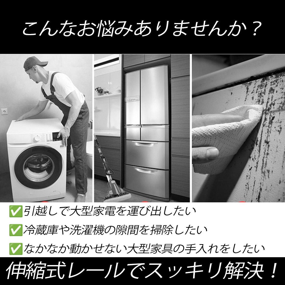 キャスター台は簡単に伸縮させて長さ調整ができ、最大70cmまで対応しますので、様々なサイズの大型家電や家具にフィット。