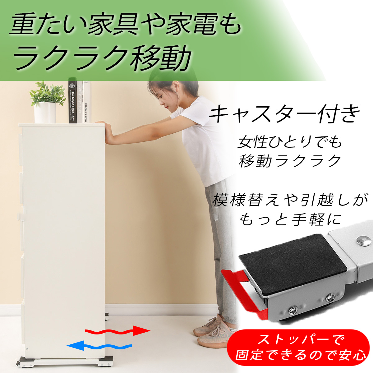 約4cmの厚みで、ほとんどの家具や冷蔵庫・洗濯機の高さをあまり変えずに設置でき、片側12個のローラーにより内部や床へのダメージを最小限に抑えます。