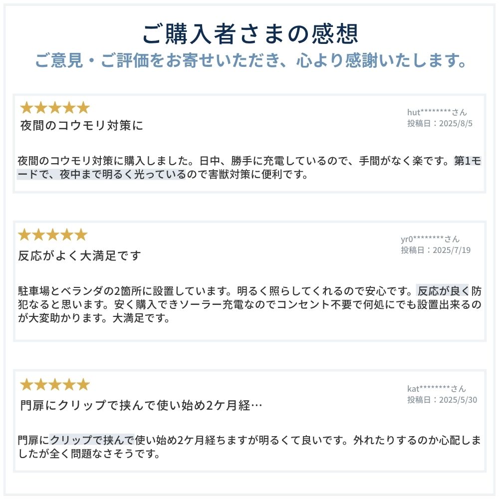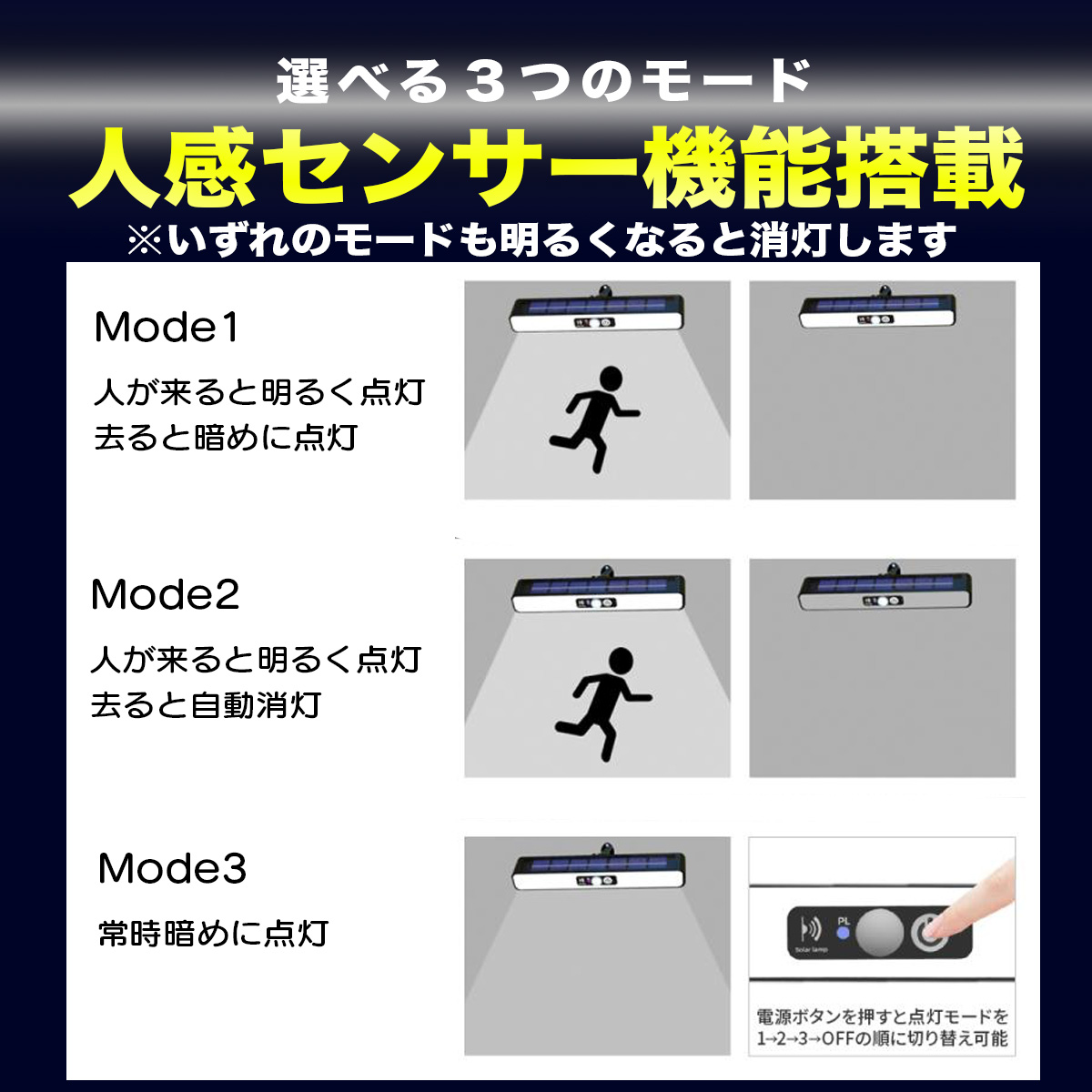 人感センサーと明暗センサーを搭載し、3つの点灯モードを選べ、防水・防塵機能で屋外使用にも安心です。