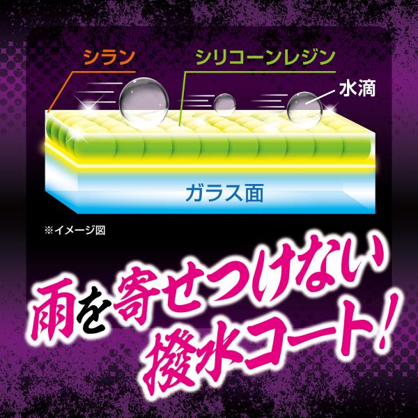 ・2つの成分であるシリコーンレジン成分とシラン成分が、ガラス表面に密着し、強固な撥水被膜となり効果を持続させます。