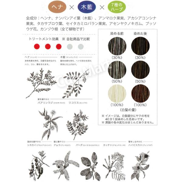 全成分:ナンバンアイ葉、ヘンナ、アンマロク果実、タカサブロウ葉、セイタカミロバラン果実、アカシアコンシナ果実、ブッソウゲ花、カンゾウ根