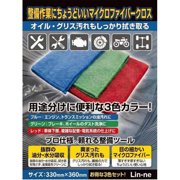 整備用 マイクロファイバークロス アソートカラー3枚セット 約330×360mm オイル・グリス汚れ対応 超吸水 速乾 拭き取りクロス 車 バイク 自転車 工具清掃
