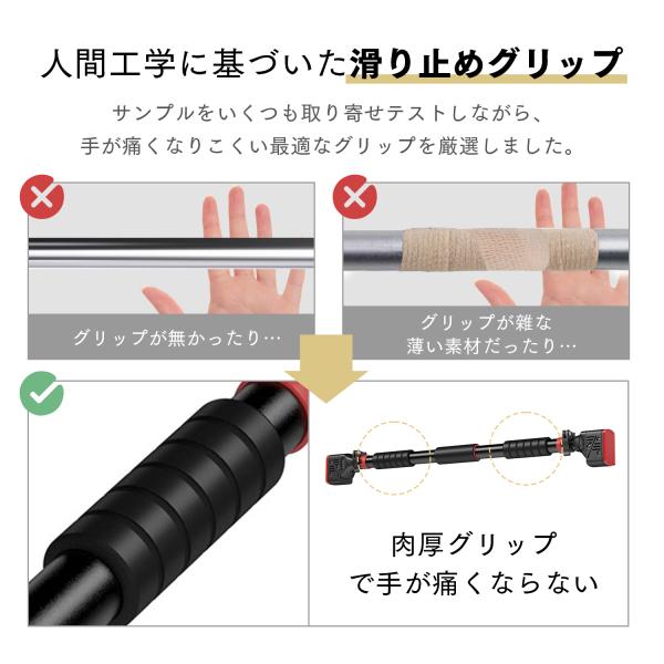 購入する前にドア枠の内側のスペースを測定してください。 ご利用の前に、懸垂バーがドアにちゃんと固定しているかどうかを確認してください。 お子様への利用を禁止します。子供に届かない場所で保管してください。 重方器具なので、クッションを採用しても、ドアに傷跡をつけるのをすべてに避けることができませんが、ご理解の上に注文してください。