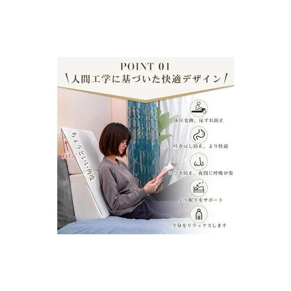 胃酸の逆流を防ぐには、就寝時に背中を15cm~20cm上げて寝ると良いと言われています。こちらの三角枕は高すぎず低すぎず最適な17度で、仰向けでもうつ伏せでも最も快適です。
