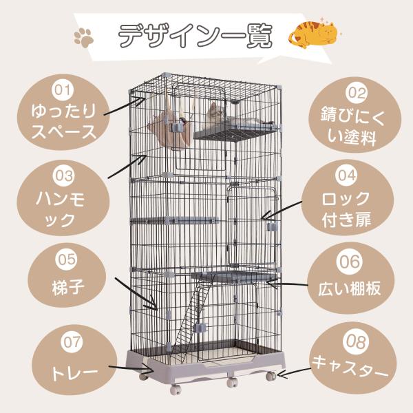 猫 ケージ キャットケージ 2段/3段 スリム 大型 キャスター付き 移動便利 多頭飼い 脱走防止 留守番 猫ハウス ハンモック付き 82*57*124cm 82*57*179cm