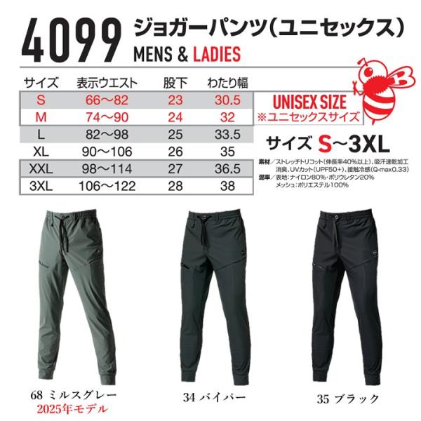 バートル 2026 冷感 ひんやり ジョガーパンツ 4WAYストレッチ 4099 春夏 吸水速乾 UVカット 接触冷感 ナイロンファイバー 男女兼用 制服 作業服 BURTLE 即日発送