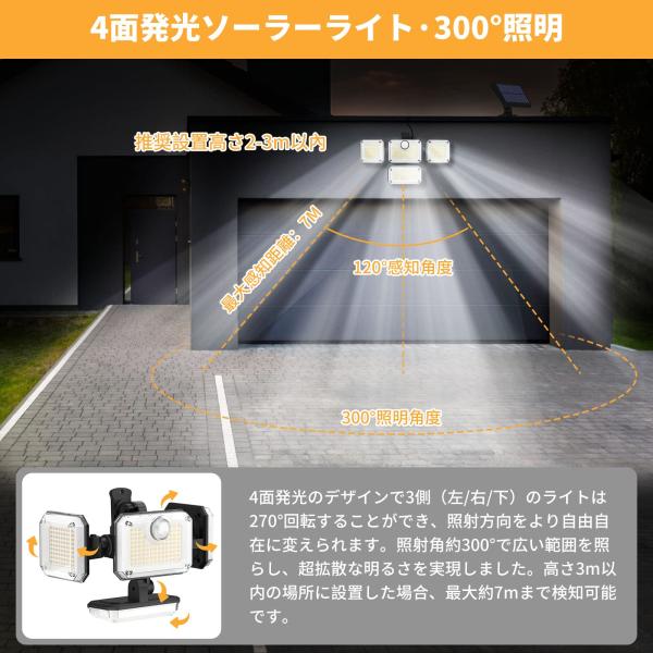 【333個高輝度LED・4面発光・300°広範囲照明】このソーラーライトは昼光色7700k超高輝度の33個LEDを採用し、効率的で、照明効果に優れて、超明るく点灯できます。4面発光のデザインで3側(左/右/下)のライトは270°回転することができ、照射方向をより自由自在に変えられます。照射角約300°で広い範囲を照らし、超拡散な明るさを実現しました。