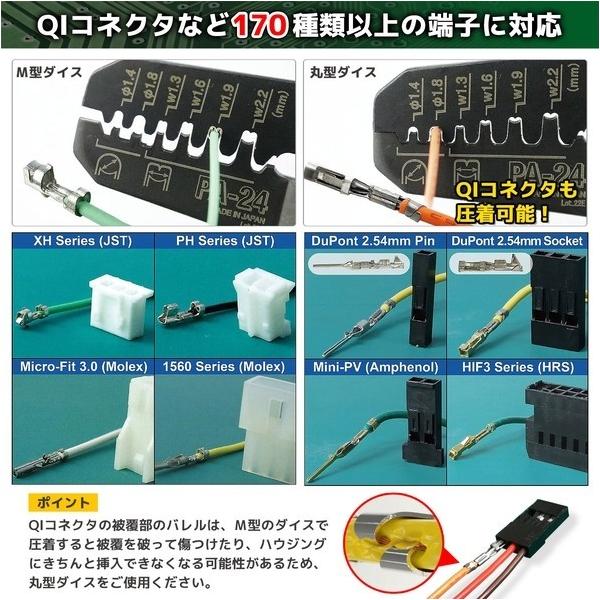 長 高精度なダイスで、小型のオープンバレル端子やQI端子の圧着に適した圧着ペンチです。 M型ダイスと丸形ダイスの2種類のダイスを搭載しています。 芯線バレルと被覆線バレルを個別に圧着するため、170種以上の端子を高精度に圧着できます。 圧着時の視認性が高く、圧着不良を防止します。 手のひらサイズのコンパクト設計。 ボルトカッターを搭載し、小ネジの長さを調節できます。 グリップは耐油性に優れ、環境に優しいエラストマー。 手によくフィットするデザイングリップ。 用途 小型のオープンバレル端子の圧着作業に。 QI端子の圧着に。 ハーネスの試作やコネクターの補修 ダイス幅:丸型/φ1.4、φ1.8mm、M型/1.3、1.6、1.9、2.2mm 接続端子用 全長(mm):160 落下防止用ひも取付穴:無 【サイズ】 160mm 【重量】 115g 【入数】 1個 PA24