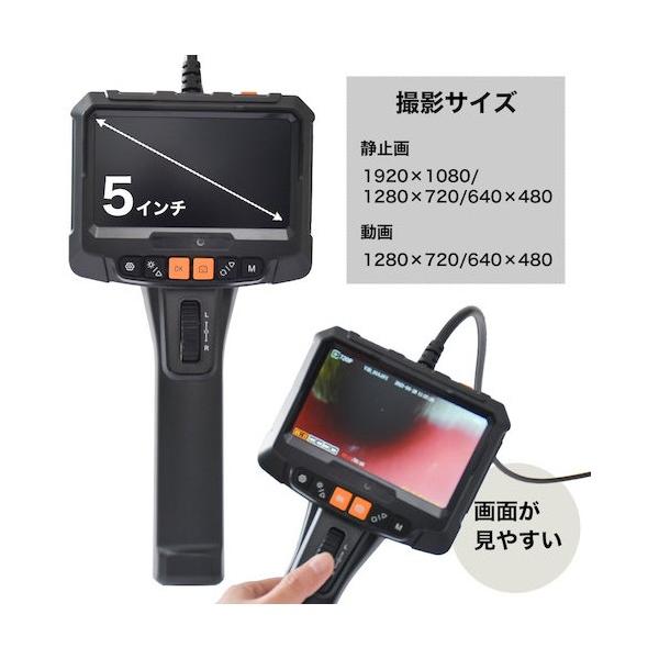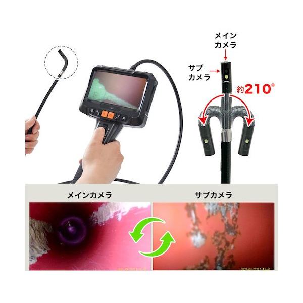 ■特長 【先端が曲がるメインとサイドの2カメラを搭載した8mm工業用内視鏡】 手元の操作で約210度湾曲するメインカメラと、側面を見ることができるサイドカメラと2つのカメラを搭載した工業用内視鏡です。 それぞれに調光可能なLEDライトを搭載。 内蔵バッテリー仕様、カメラケーブルは1m、2m、3mをラインナップ。 1920×1080の写真、1080×720の動画を撮影することができます。 【2つのカメラ搭載・約210度湾曲するカメラケーブル】 側視カメラ付先端可動内視鏡は2つのカメラを搭載したファイバースコープです。 メインカメラはカメラケーブル先端部に、サブカメラは先端側面に搭載されています。 カメラは手元の操作で左右に約210度湾曲させることが可能。 メインとサブカメラの切り替えと湾曲により、観察し 【入数】 1点 SKDYSNS2M