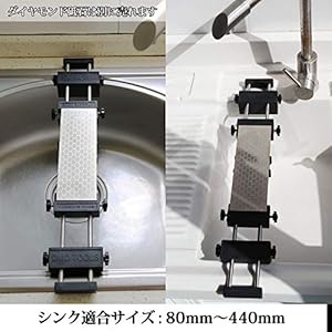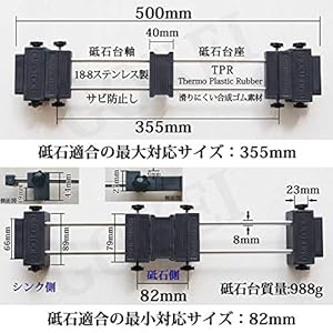 シンクブリッジ 砥石台 ステンレス製 シンク適用 滑り止め固定台 【材質】: 砥石台軸: 18-8ステンレス製 砥石台座: 滑りにくい合成ゴム素材 ※錆に強い高品質な18-8ステンレス製の為、変色、サビに絶対の安心感! ※ご使用後はサッと洗って水切りするだけでお手入れも簡単です。 【本体質量】: 988g 【砥石適用寸法】: 82~355mm 【シンク適合サイズ】: 280mm~440mm 【砥石台寸法】:全長505*幅88*厚さ43mm 【使い方】:土台の両側にボルトがあって、砥石のサイズに合わせて、調整することが手軽にできます。 【注意】:油脂を付着させないでください。 【用途】:砥石の保持台