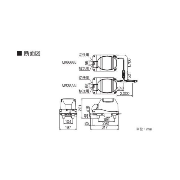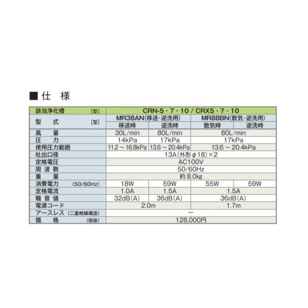 浄化槽メーカーでもあり、エアーポンプメーカーでもあるフジクリーン社製の専用ブロワ。適用浄化槽型式:CRN-5・7・10 CRX-5・7・10 使用圧力範囲:13.6〜20.4kPa(MR38AN 移送30L時は11.2〜16.8kPa)