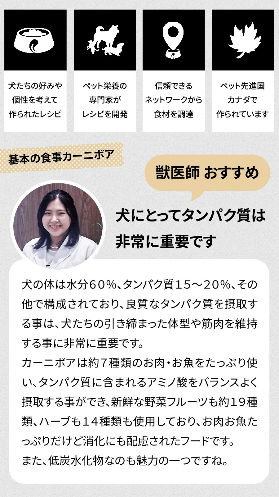 「カーニボア=肉食」のシリーズ名が表すとおり、贅沢に動物性原材料を配合したとびきり美味しいグレインフリーのプレミアムドッグフードです。上質なチキン、ターキー、ダックなど多様な肉・魚類を組み合わせ、強くしなやかな筋肉の形成をサポートします。オメガオイル、健全な消化機能を助けるプレバイオティクス、プロバイオティクスを配合しています。しっかり噛んで食べられる中粒タイプで、運動量の多い子やお肉たっぷりフードが好きな子におすすめです。