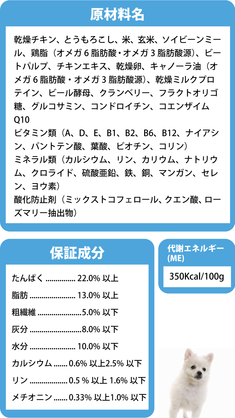 ・皮膚や被毛の健康維持のために、オメガ6脂肪酸・オメガ3脂肪酸と亜鉛を含んでいます。