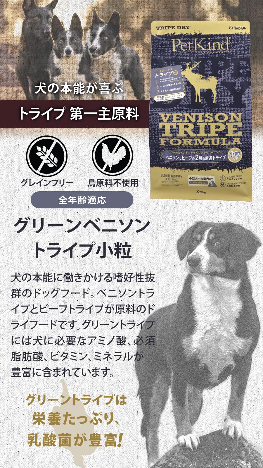 犬/ドッグ/ドック/フード/グレインフリー/穀物不使用/鳥原料不使用/鹿肉/オメガ3/オメガ6/ペット/PetKind/TripeDry