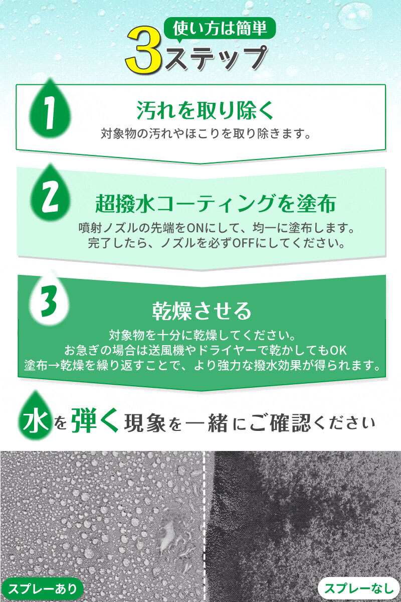 塩水・雨水だけでなく、泥水の付着を防ぐことができる。素材を長時間保護できる。スプレーして乾燥させるだけの簡単操作で抜群の効果!原液は食品衛生法取得で安心・安全!PFOS規制非対象で安全!